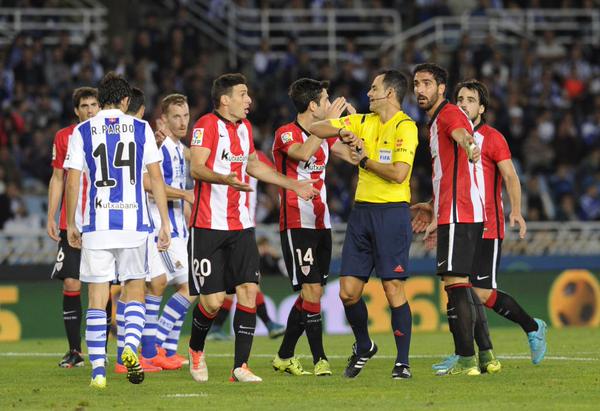 Corría el minuto 40 del primer tiempo cuando llegó la jugada que pudo cambiarlo todo. Chut de Aduriz dentro del área, Illarra se lanza a tapar el disparo que impacta en uno de sus brazos. El balón sale desviado por línea de fondo y los jugadores del Athletic protestan unánimemente a Velasco Carballo (del colegio madrileño) la clara acción, ya que el jugador de la Real tenia los dos brazos extendidos lo que, teóricamente, debería de facilitar ver el penalti. El ex del Real Madrid además tenía una tarjeta amarilla previa con lo que habría supuesto la expulsión del mediocentro además del consecuente lanzamiento desde los once metros. Pero a nuestro juicio lo más grave de todo esto es que el colegiado se percató de las manos del jugador realista, ya que durante la protesta de los leones el trencilla alegaba con sus gestos de que fue una jugada involuntaria y justificando que el balón fue quien impactó en el jugador. Error grave.
